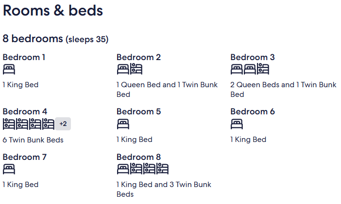 Bedroom Arrangements: I have reached out to a few people for a few small changes with the bedroom arrangements. So thank you for helping me move a few things around. Chad has requested a room to himself to setup his PC so he can try and find 30 cent bathroom vanities at Home Depot. Aside from the few small changes every family will have their own bedroom, the larger families will be in the rooms with multiple beds, and then the couple will be in the King bed only rooms. I have small plan for who I think should go into each room, but it might be easier to decide once we arrive. Above is a better layout of the rooming situation, but if you follow the link to the website there is better pictures of each room.